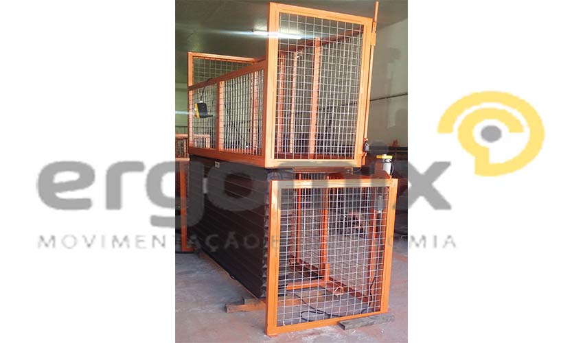 Possui botoeira de comando com acionamento sobe, desce e emergência, além de unidade hidráulica. Instalado no piso por chumbado.